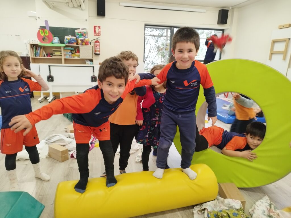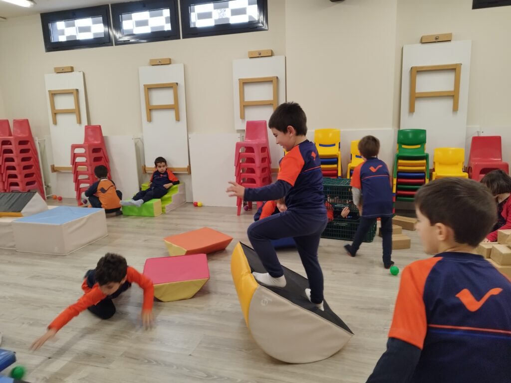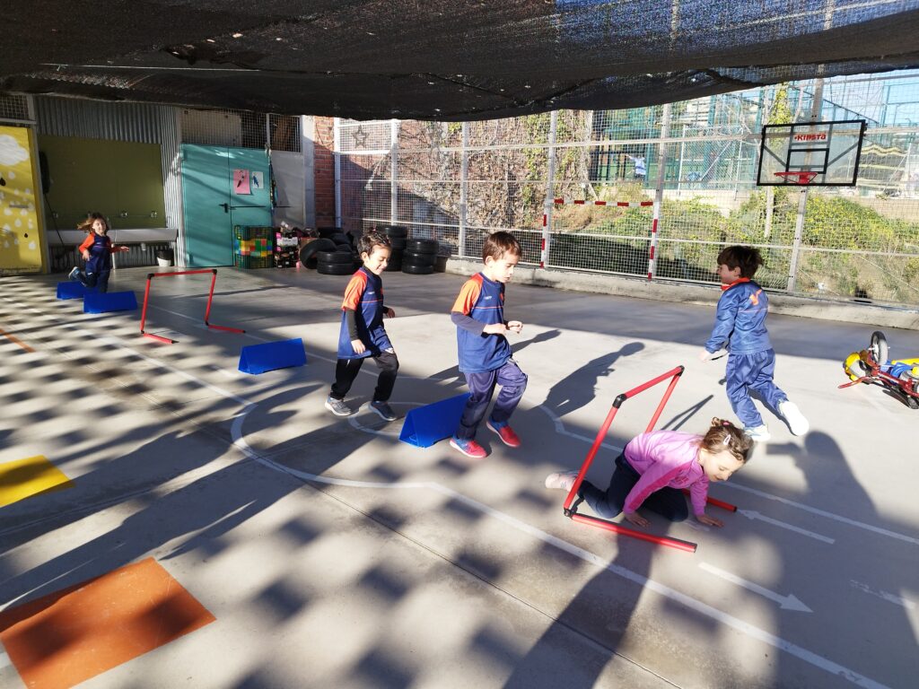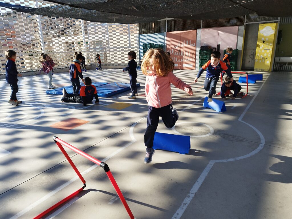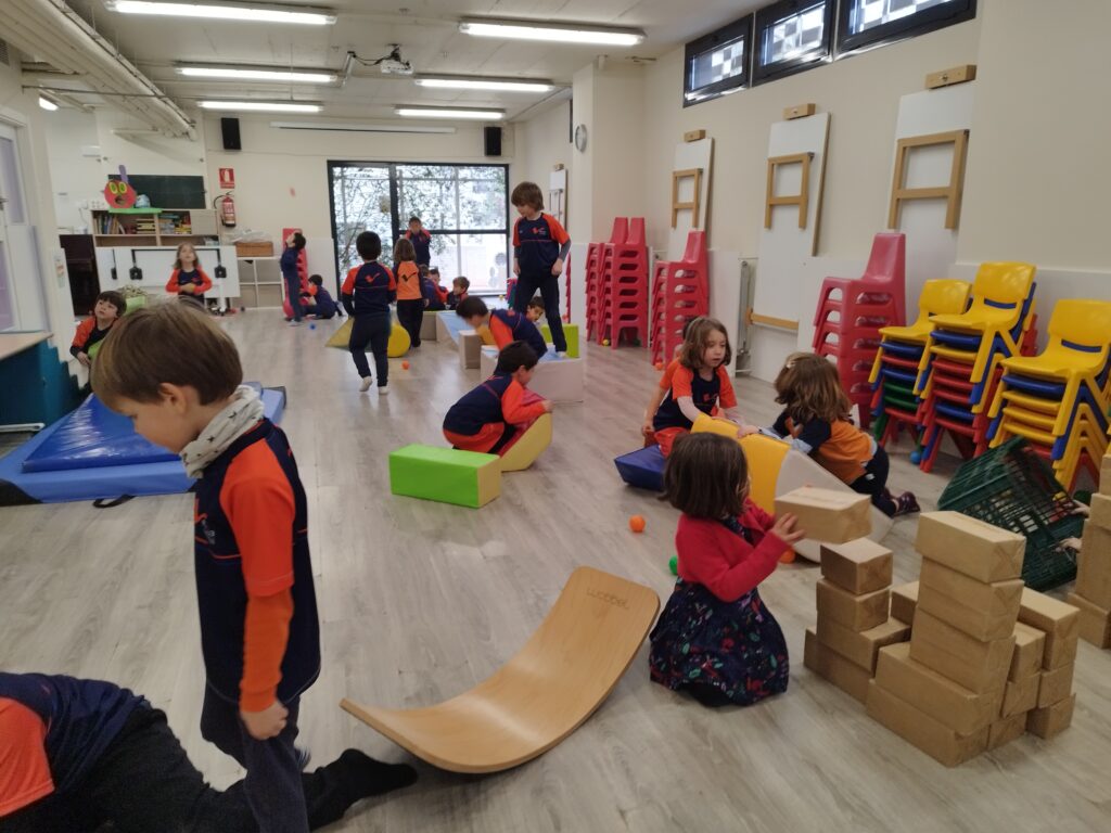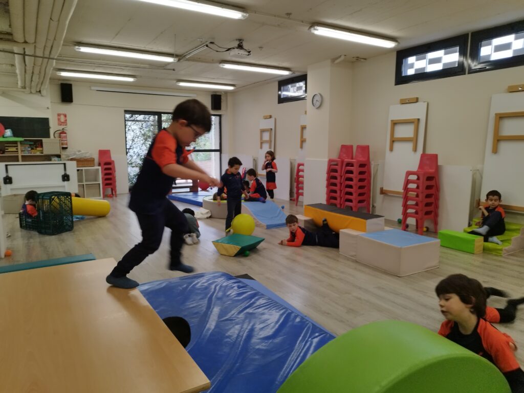 En dos espais diferents, el pati i el menjador (amb el material tou), correm, ens desplacem, saltem, fem equilibris, compartim, aprenem jocs de norma, creem nous circuits, juguem i ens ho passem d’allò més bé.