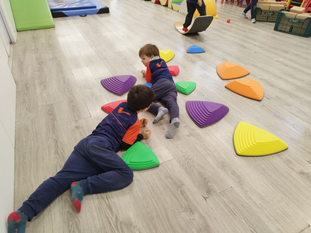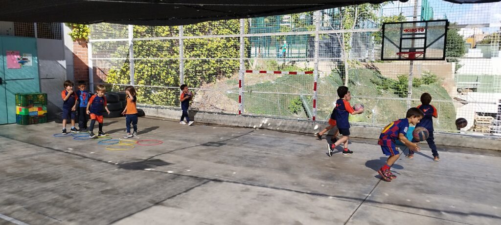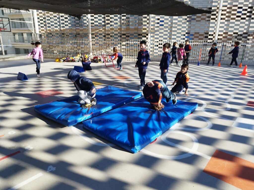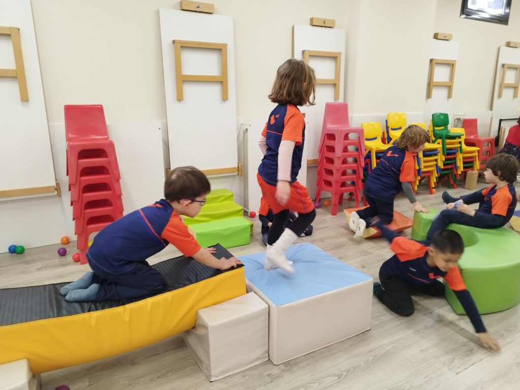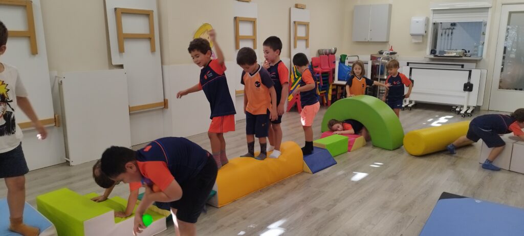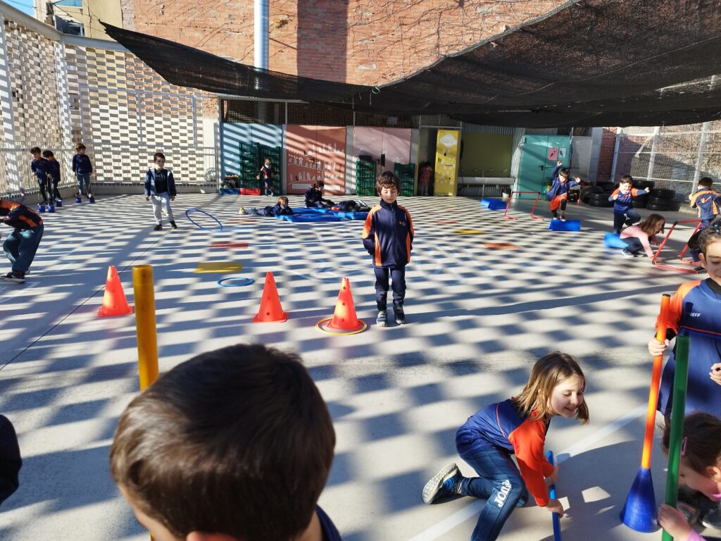 En dos espais diferents, el pati i el menjador (amb el material tou), correm, ens desplacem, saltem, fem equilibris, compartim, aprenem jocs de norma, creem nous circuits, juguem i ens ho passem d’allò més bé.