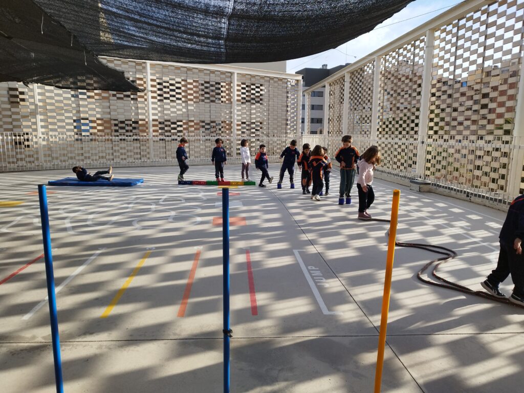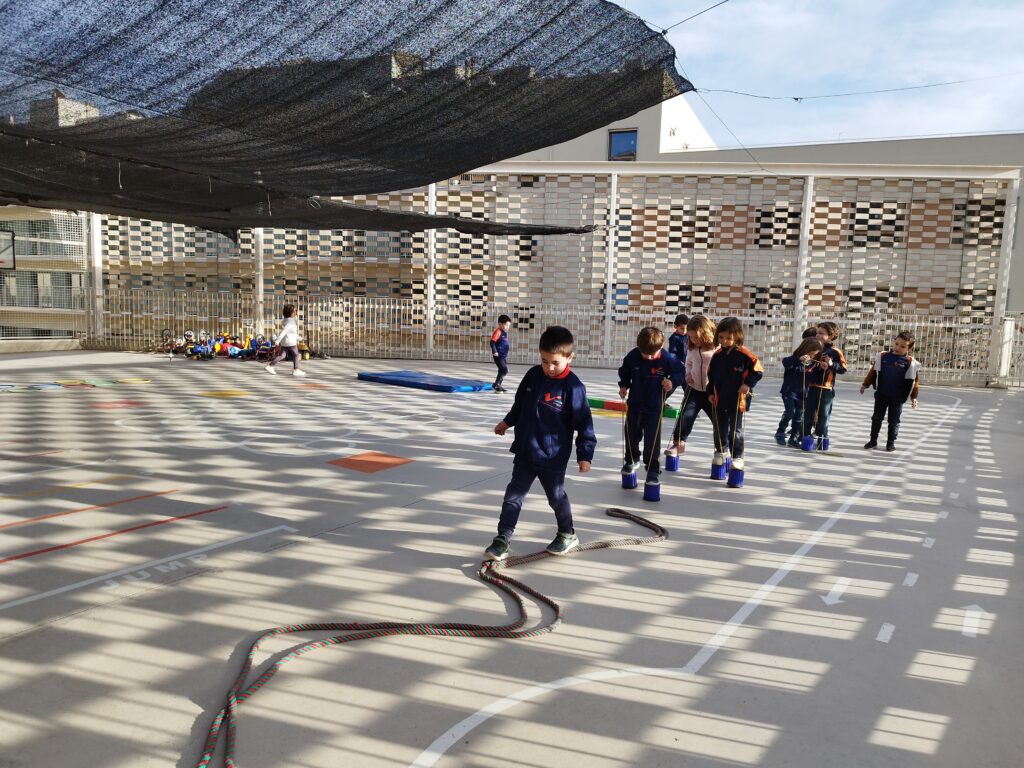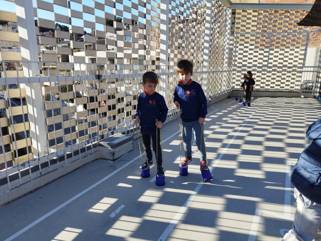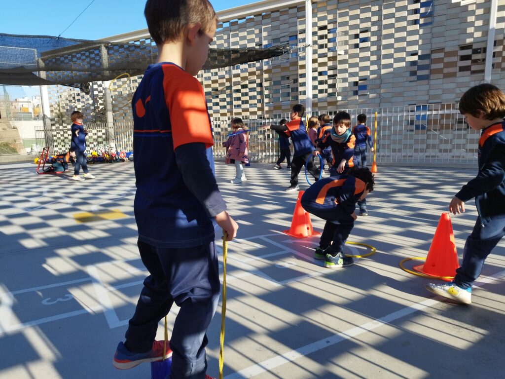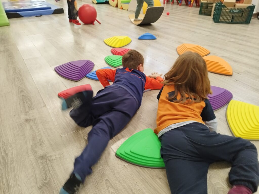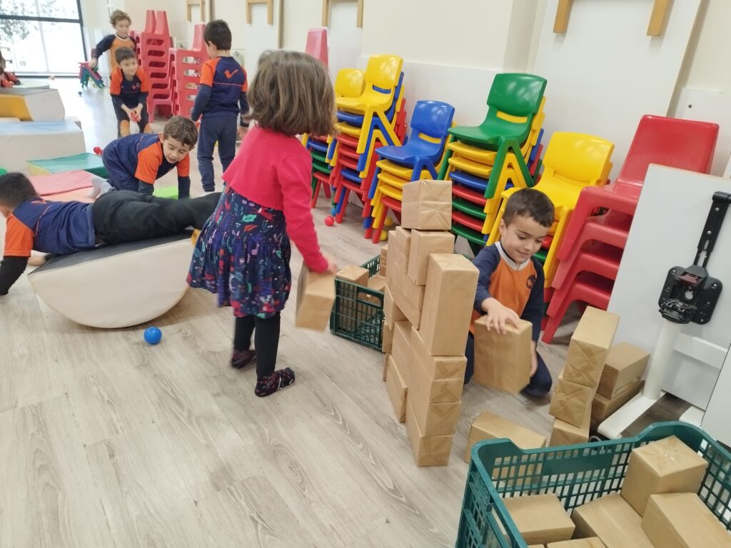 En dos espais diferents, el pati i el menjador (amb el material tou), correm, ens desplacem, saltem, fem equilibris, compartim, aprenem jocs de norma, creem nous circuits, juguem i ens ho passem d’allò més bé.