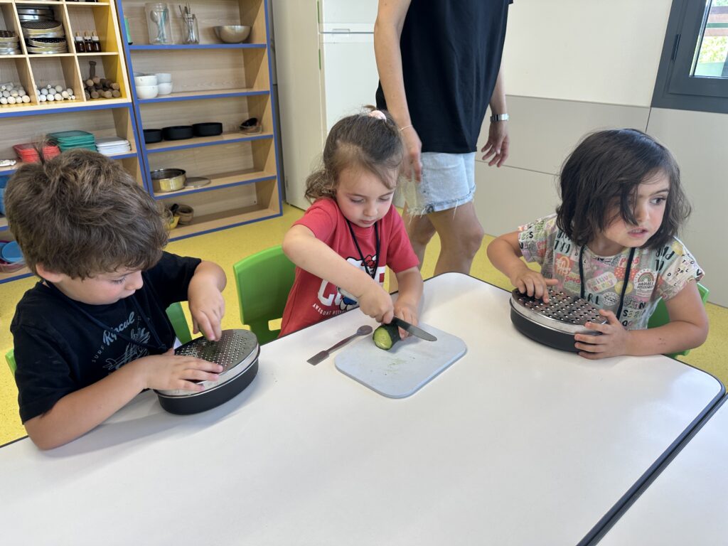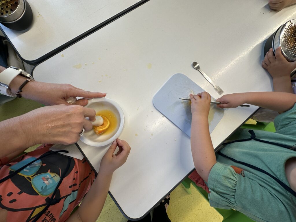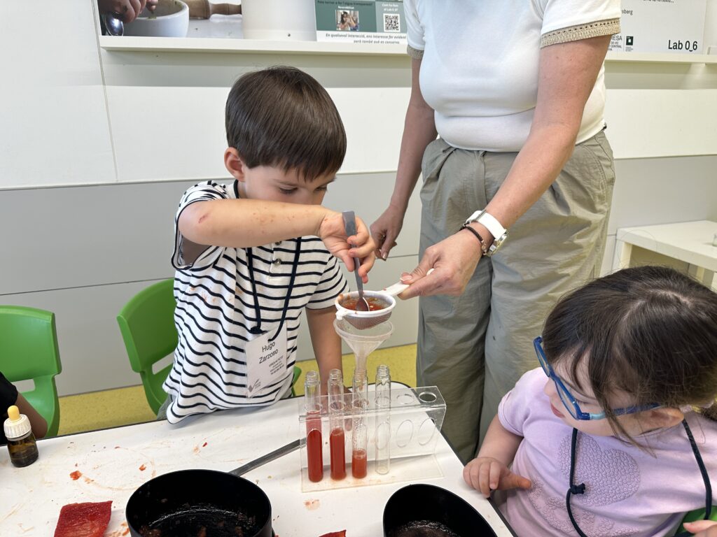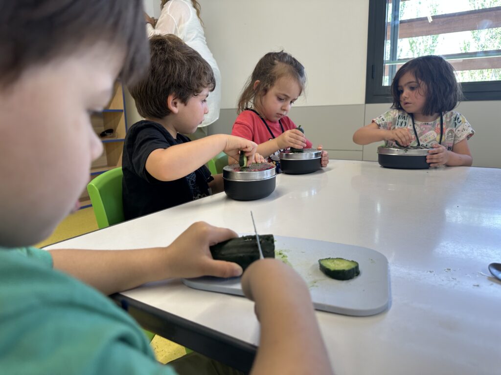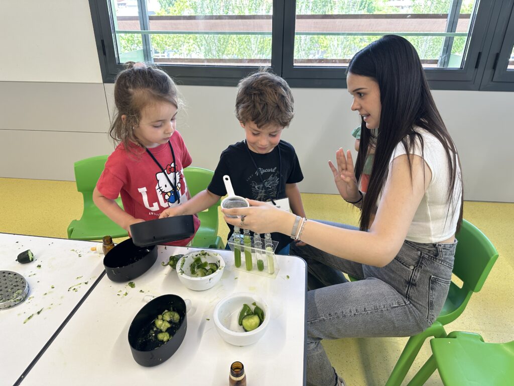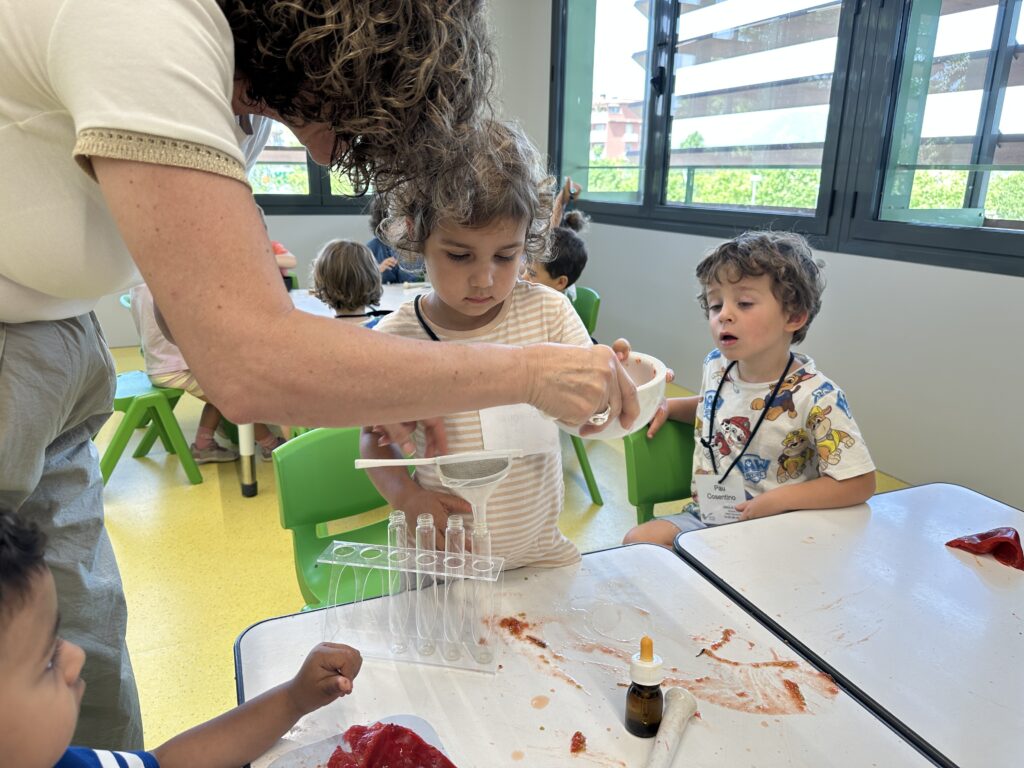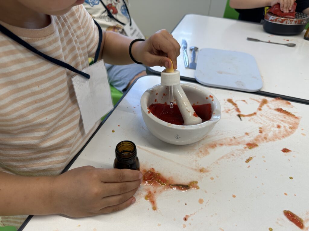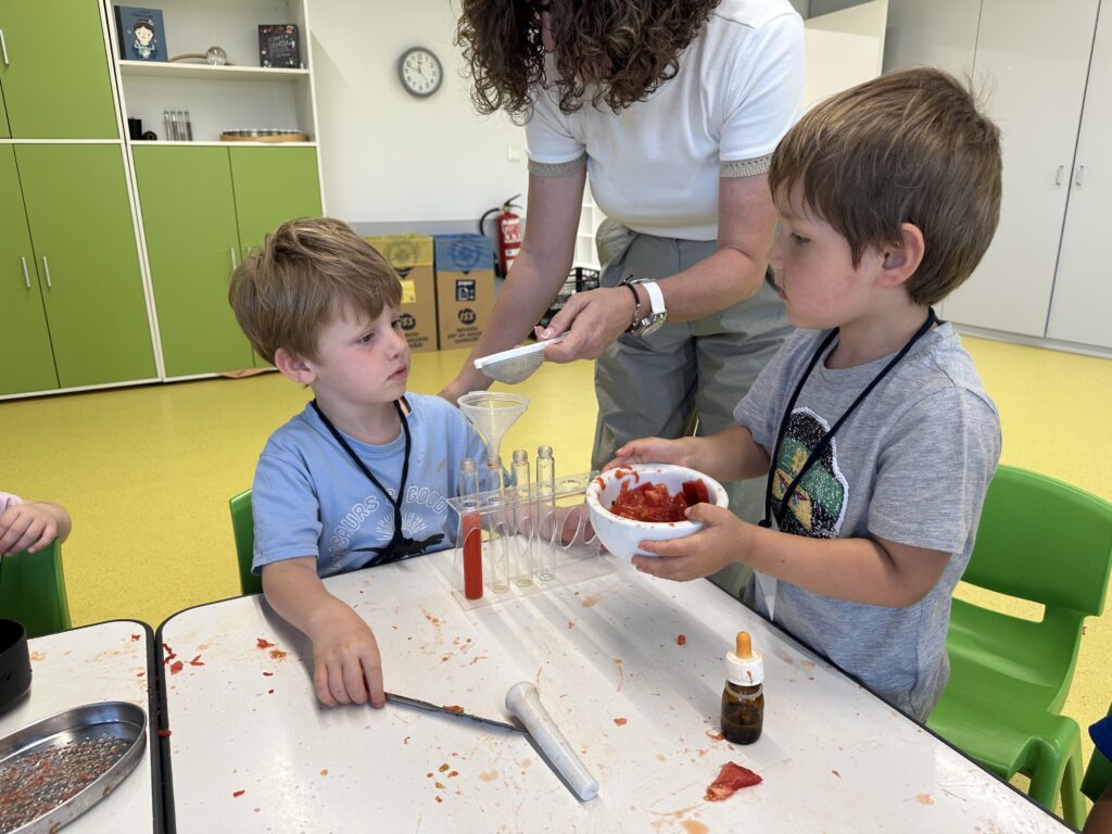 Allà hem fet un taller sobre com poder tenyir l’aigua amb fruites i verdures. Hem tallat, ratllat i aixafat les diferents fruites i verdures i després hem barrejat el resultat amb aigua i deu ni do com l’hem pogut tenyir si!
