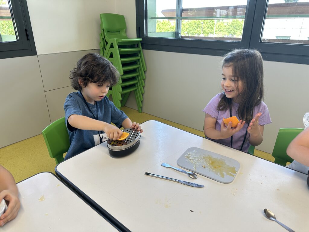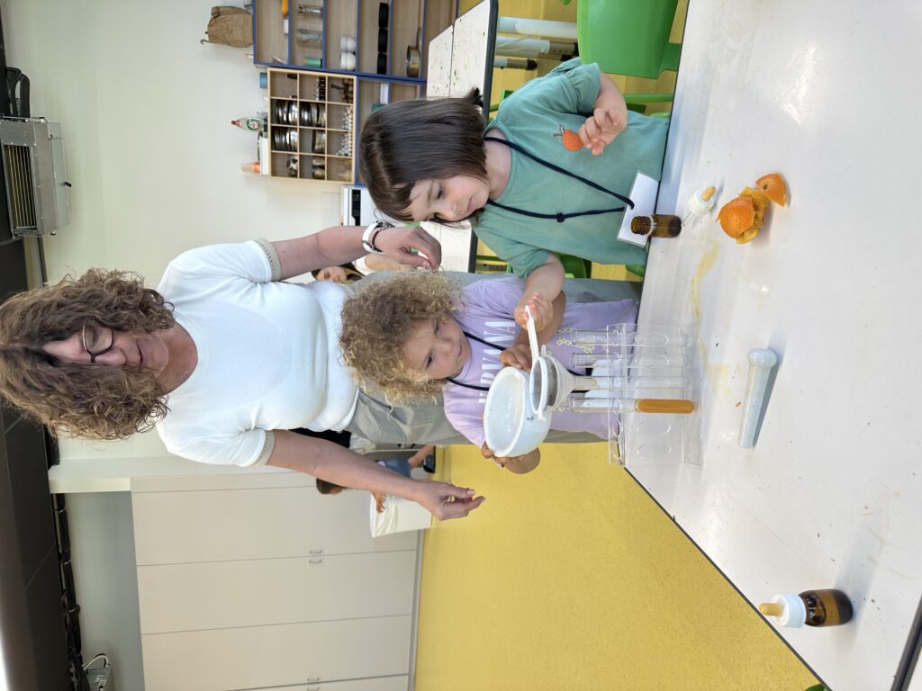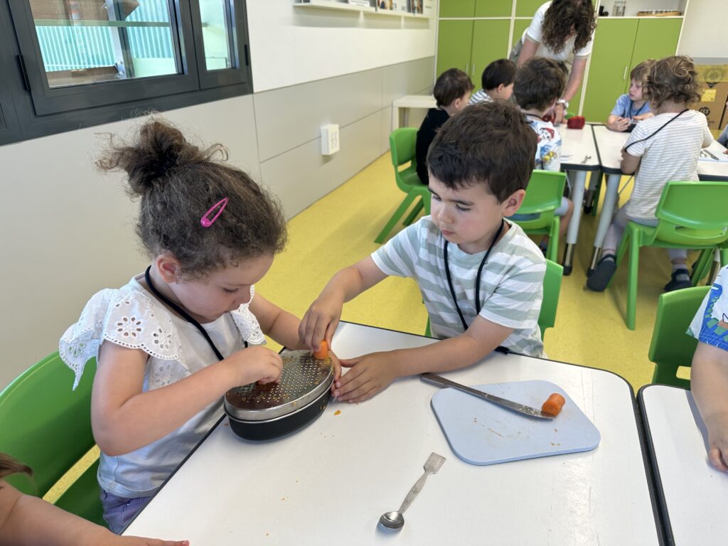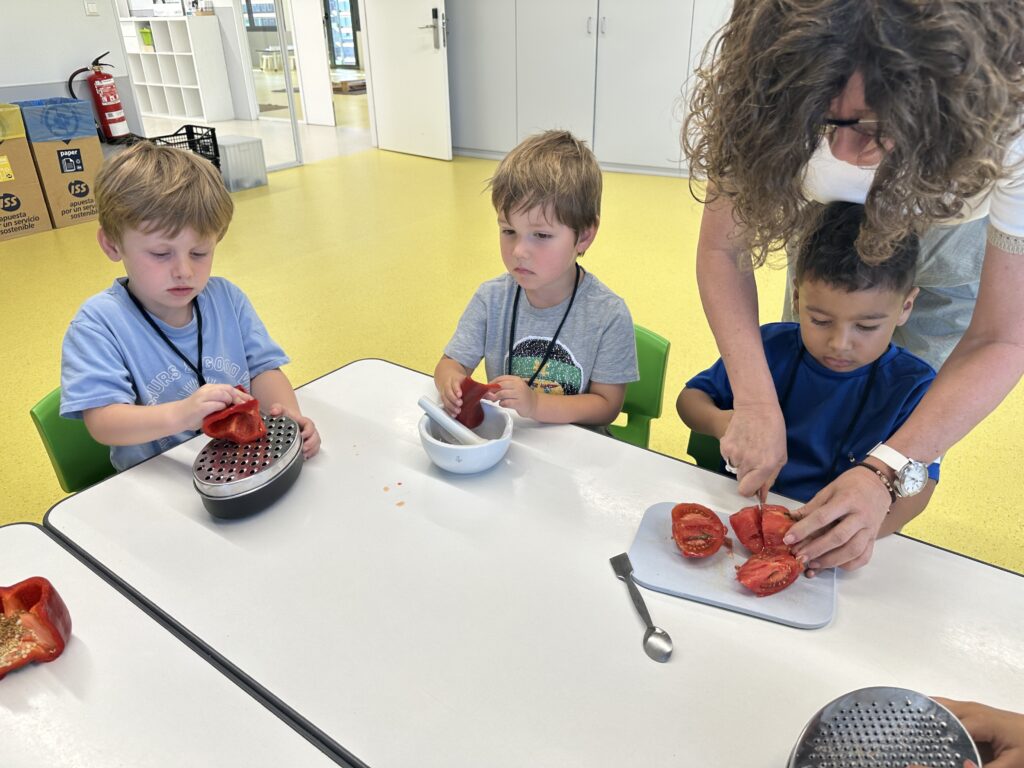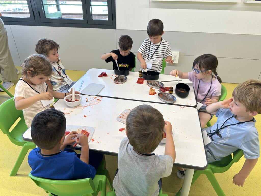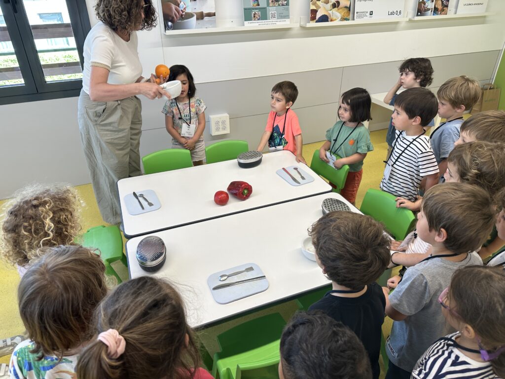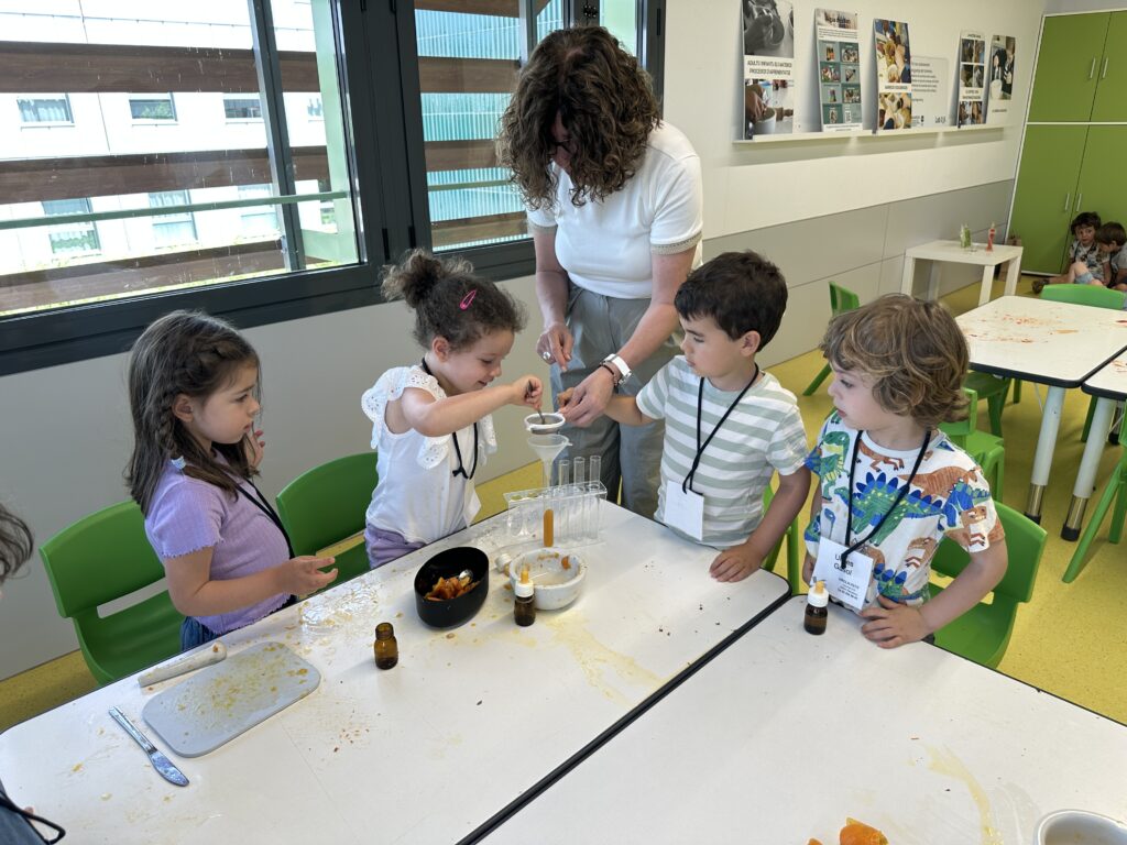 Allà hem fet un taller sobre com poder tenyir l’aigua amb fruites i verdures. Hem tallat, ratllat i aixafat les diferents fruites i verdures i després hem barrejat el resultat amb aigua i deu ni do com l’hem pogut tenyir si!
