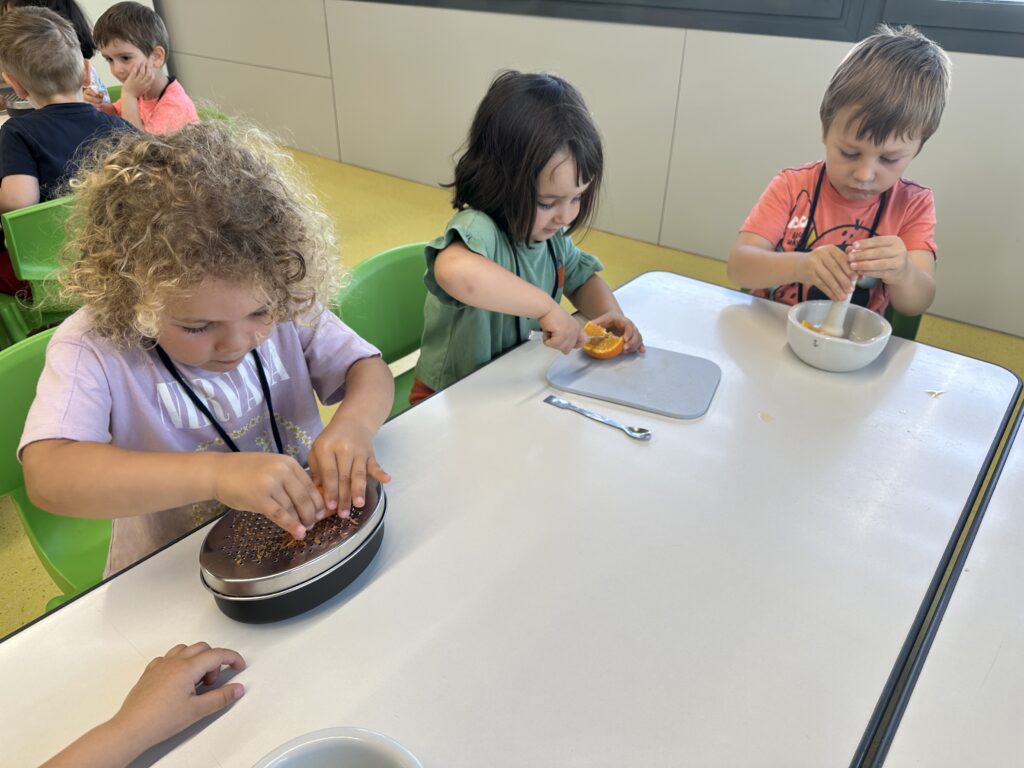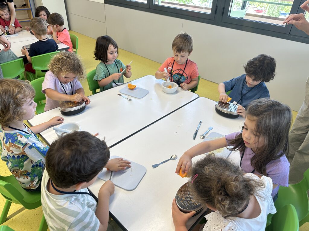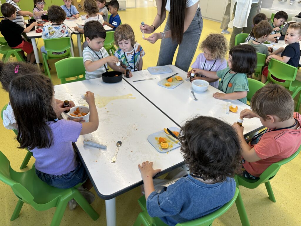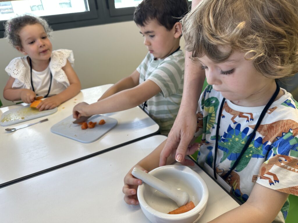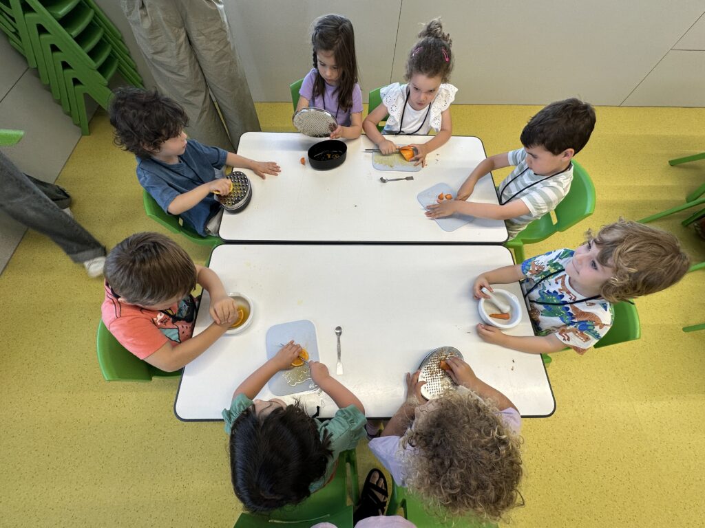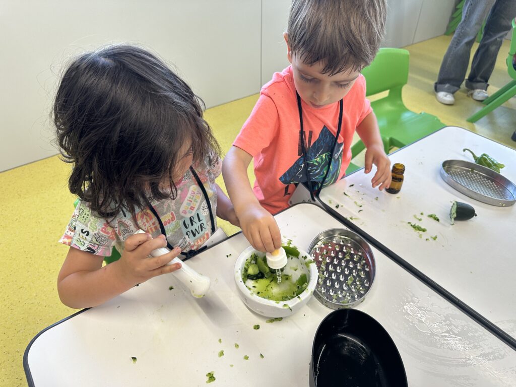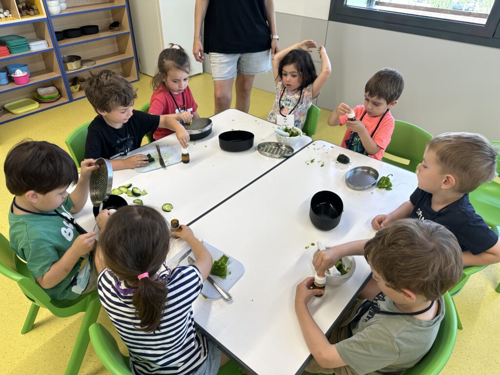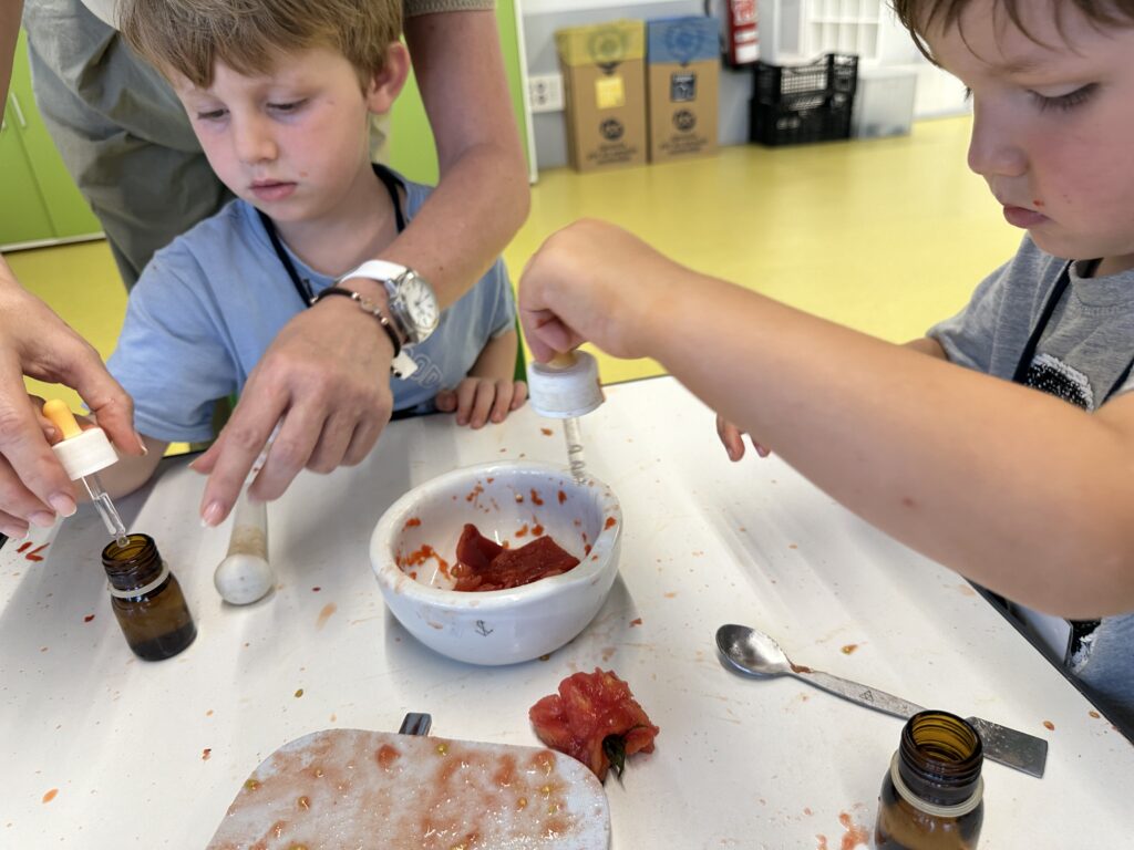 Allà hem fet un taller sobre com poder tenyir l’aigua amb fruites i verdures. Hem tallat, ratllat i aixafat les diferents fruites i verdures i després hem barrejat el resultat amb aigua i deu ni do com l’hem pogut tenyir si!
