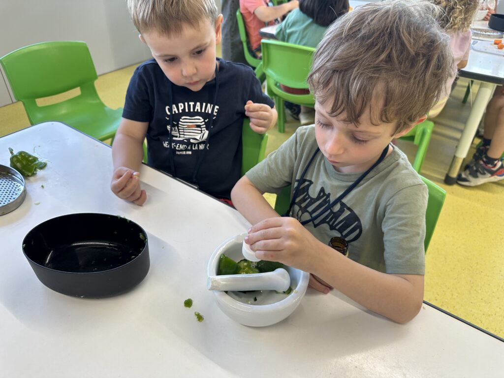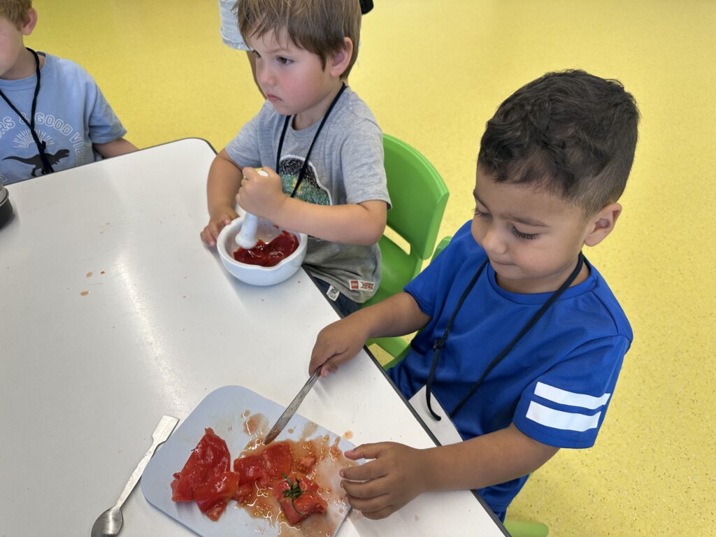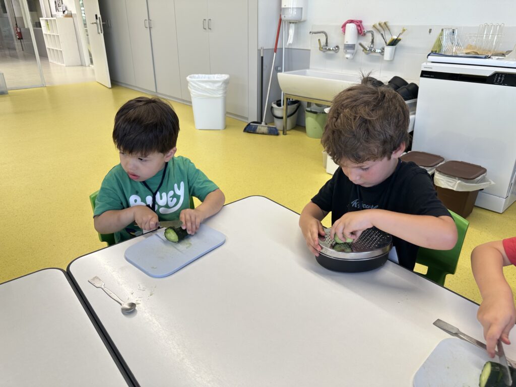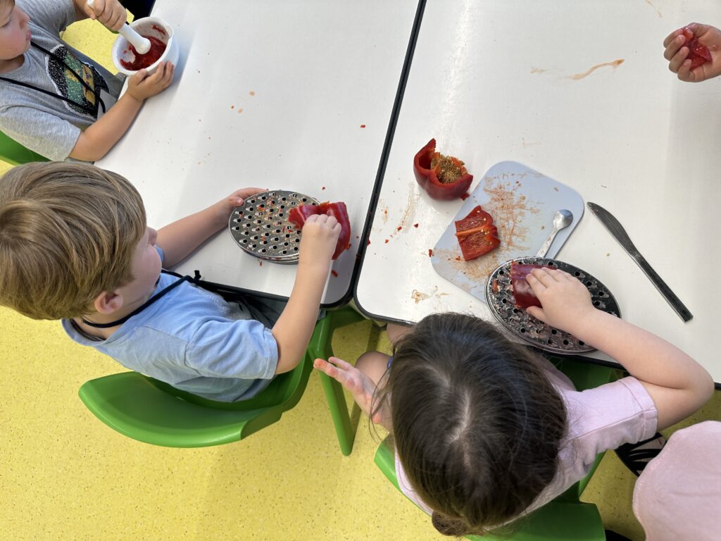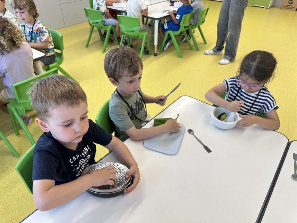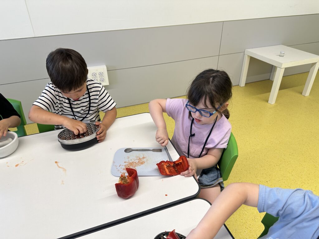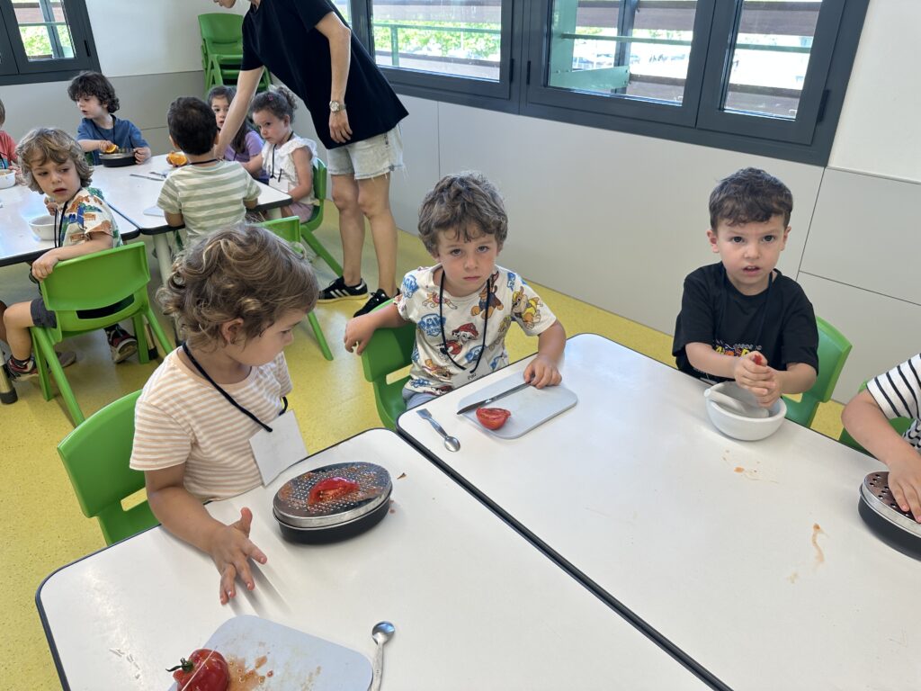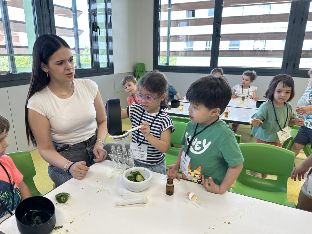 Allà hem fet un taller sobre com poder tenyir l’aigua amb fruites i verdures. Hem tallat, ratllat i aixafat les diferents fruites i verdures i després hem barrejat el resultat amb aigua i deu ni do com l’hem pogut tenyir si!