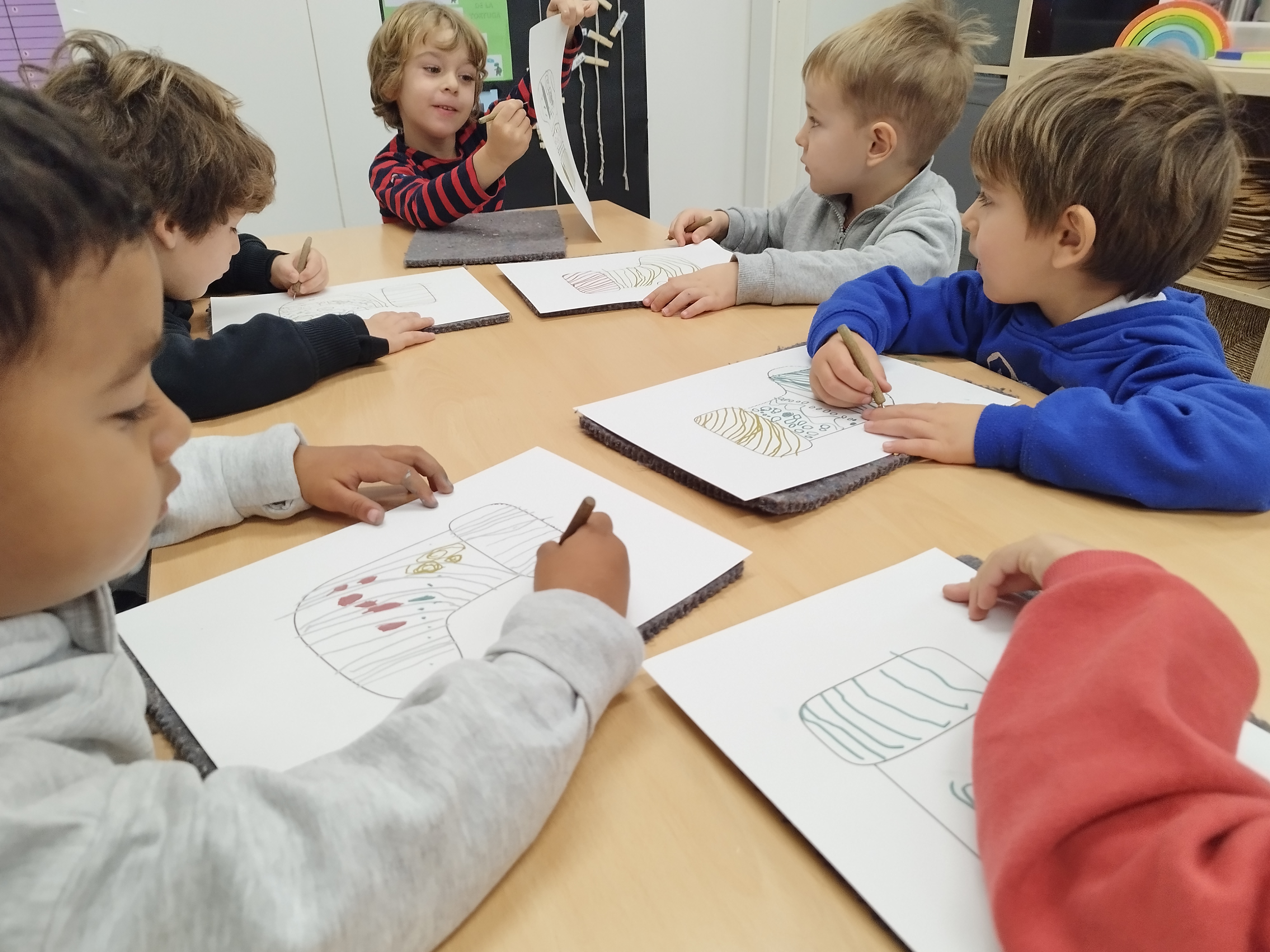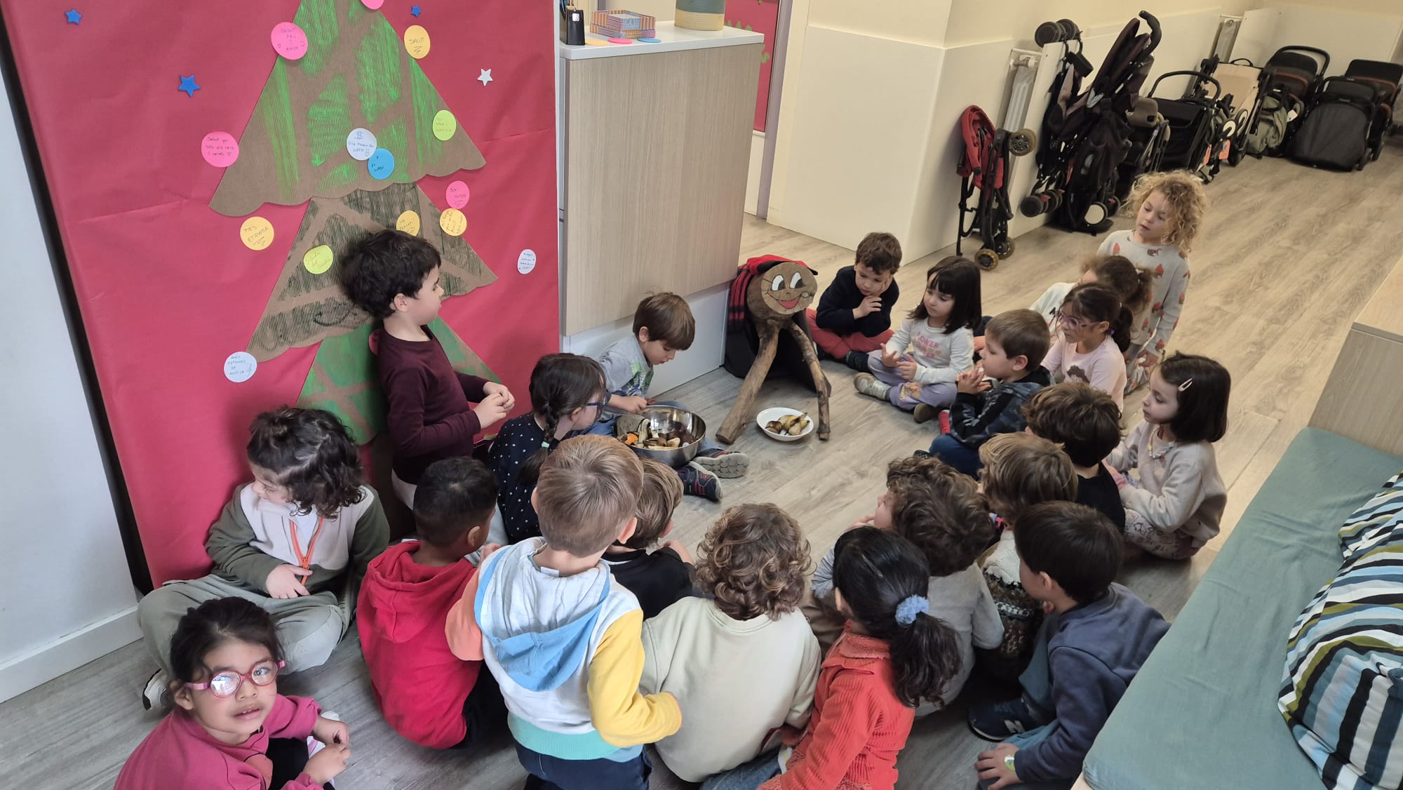 I quina millor manera d’acabar aquest trimestre que fent cagar el tió. Tots plegats hem cantat mentre li donàvem uns quants cops de bastó i… ha cagat regals per la classe per jugar tots junts!