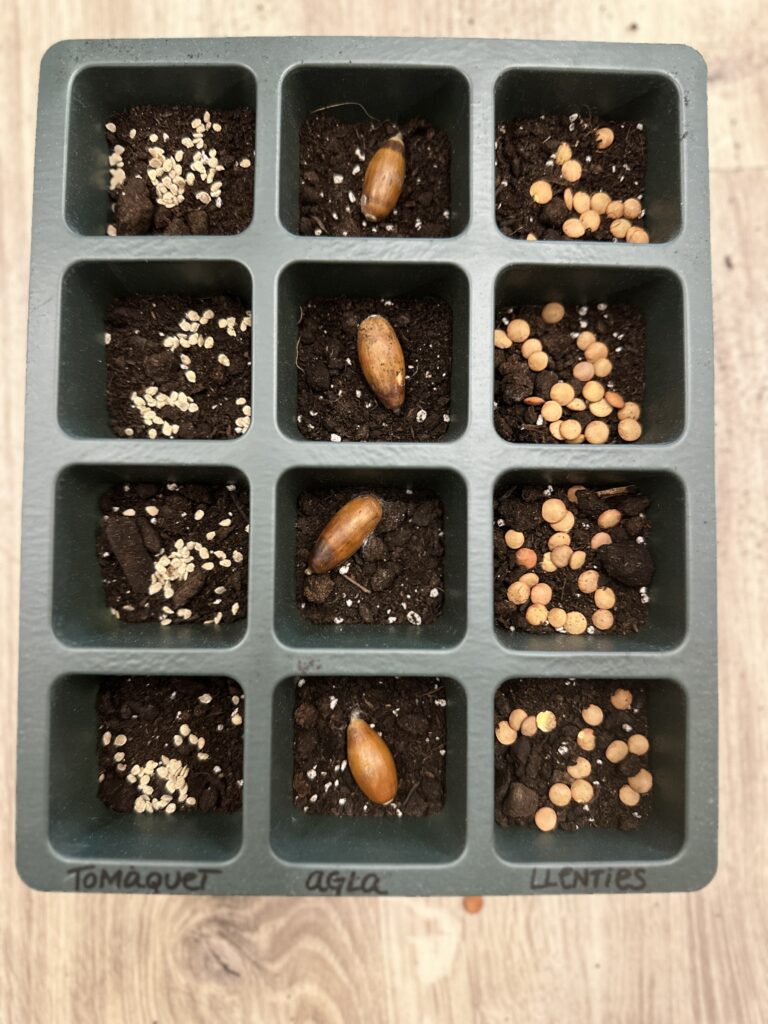 Així que hem decidit posar els aglans en terra i ja que hi erem… provar-ho també amb les llenties. I a més a més, els Pinzells quan ens van explicar que per que surtin plantetes es necessiten llavors ens van regalar unes llavors de tomàquet i… hem decidit plantar-les també!