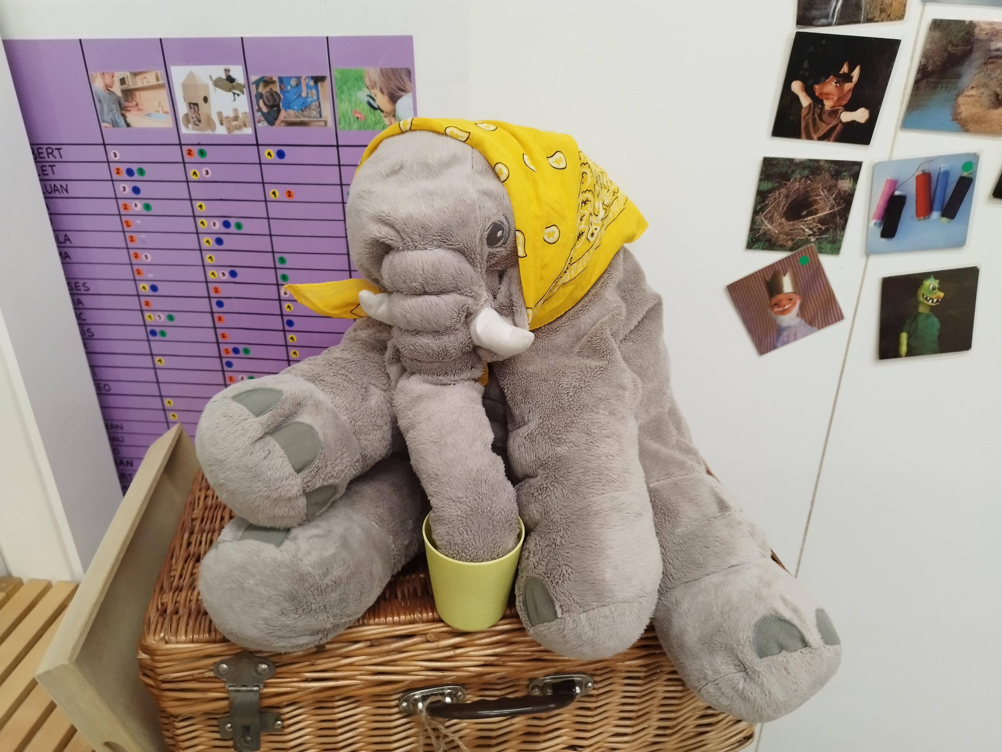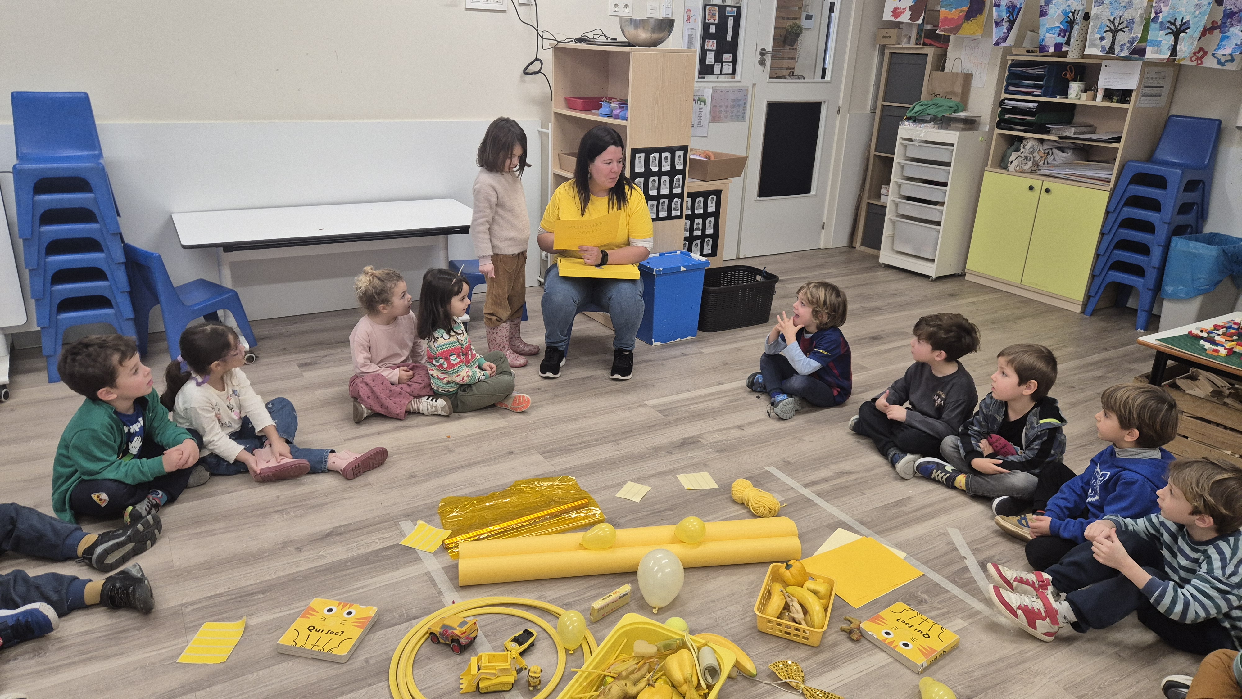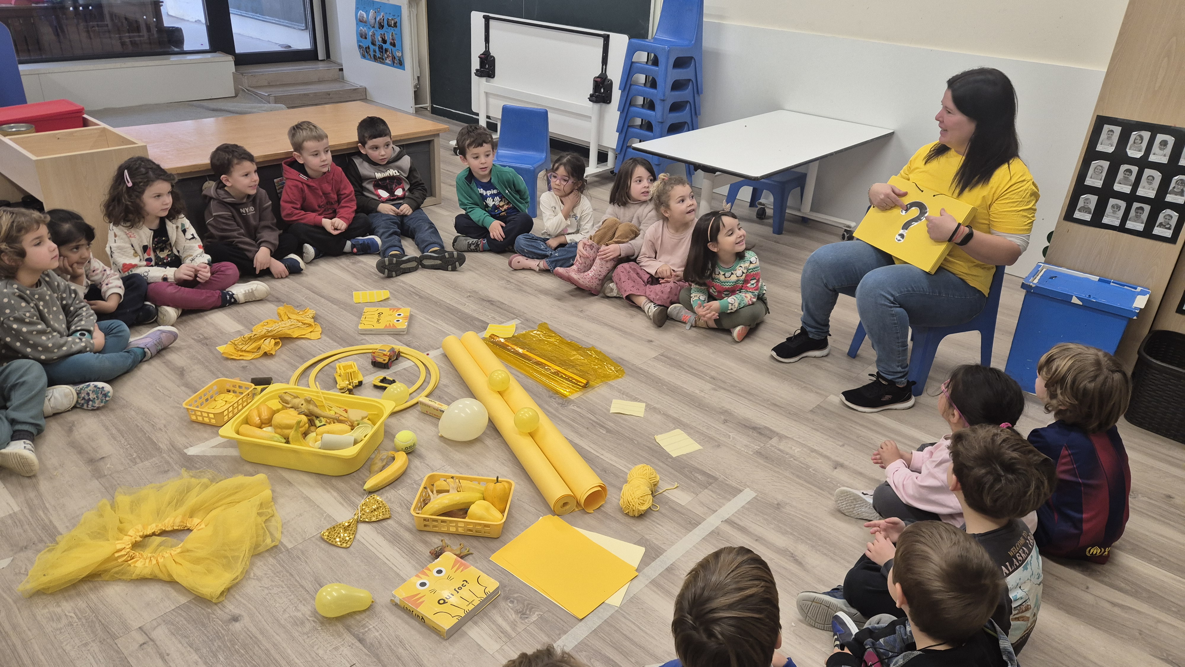 Fa unes setmanes vam tenir una súper sorpresa! Quan vam arribar del pati, vam trobar un munt de coses grogues a la nostra classe: pintura, plastilina, papers, menjar… fins i tot l’Orellotes portava un mocador groc!