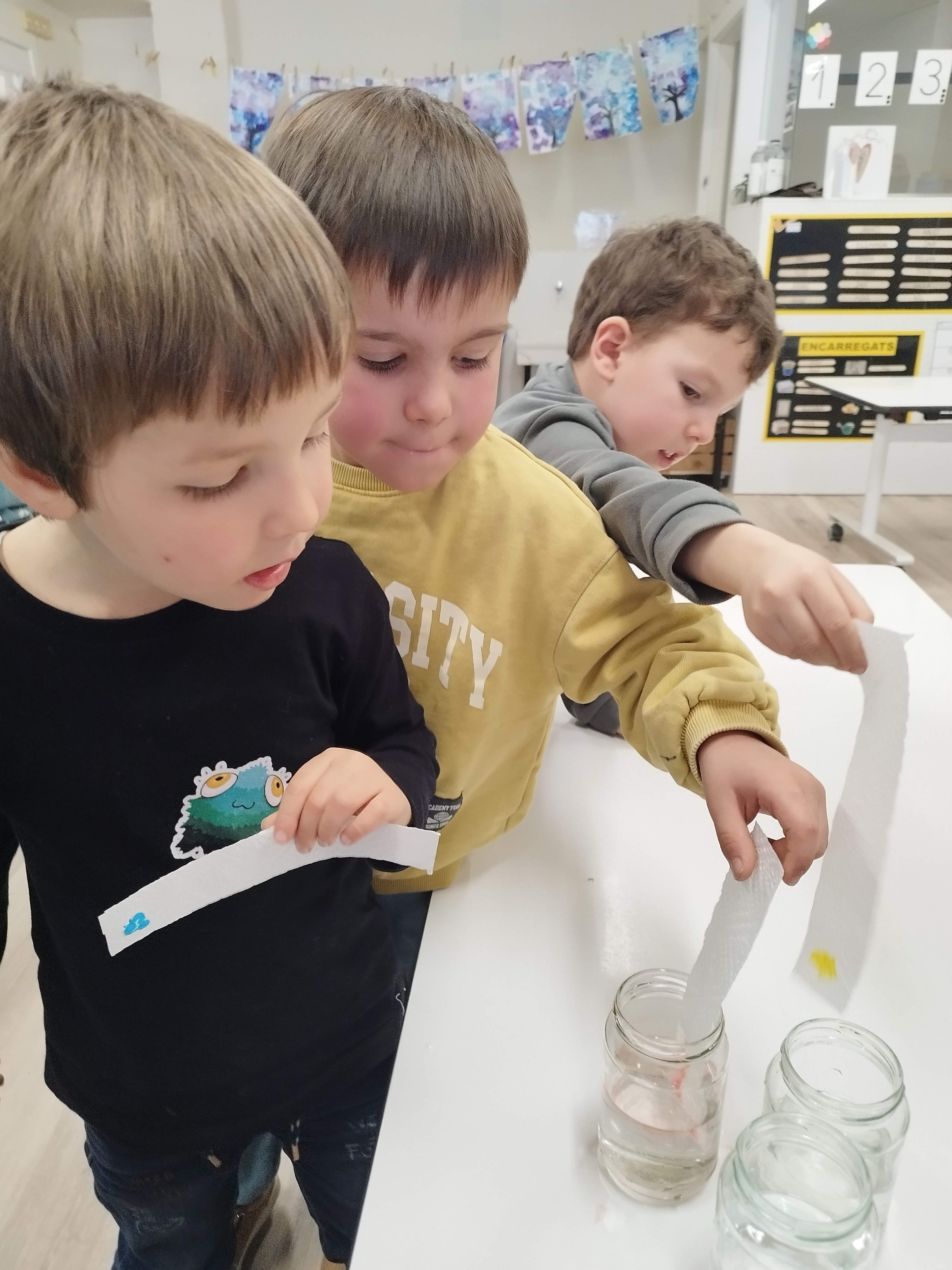 A més, coincidint amb la setmana de la ciència va venir a la nostra classe l’Anna, la mare del Jan, a explicar-nos coses dels colors i a fer un experiment. Nosaltres durant aquestes setmanes hem estat barrejant colors i ella ens va explicar que amb aigua i una mica de paciencia també els podem separar. Ens vam quedar sorpresos…semblava màgia!!