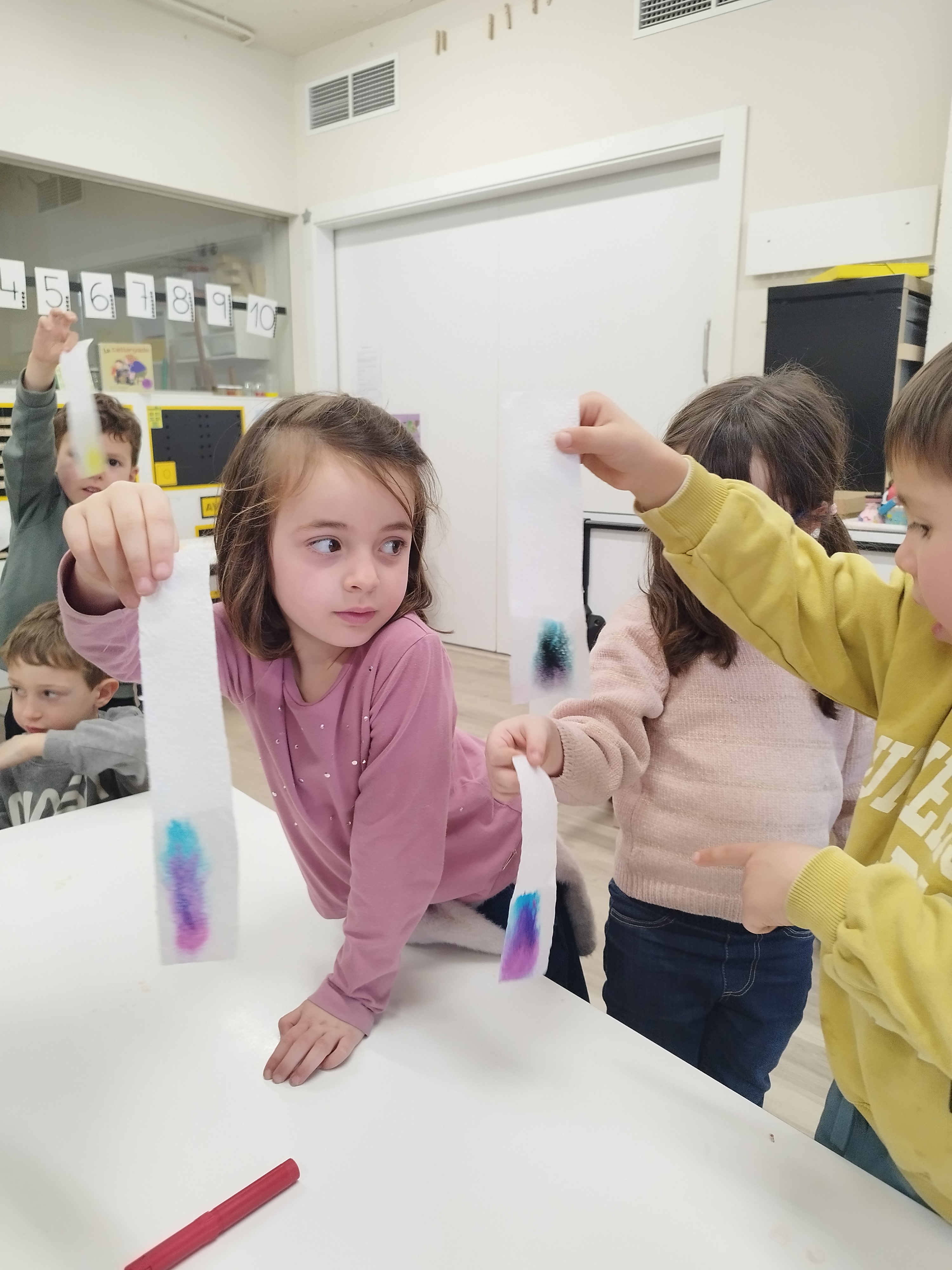 A més, coincidint amb la setmana de la ciència va venir a la nostra classe l’Anna, la mare del Jan, a explicar-nos coses dels colors i a fer un experiment. Nosaltres durant aquestes setmanes hem estat barrejant colors i ella ens va explicar que amb aigua i una mica de paciencia també els podem separar. Ens vam quedar sorpresos…semblava màgia!!